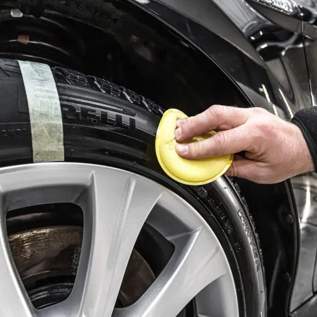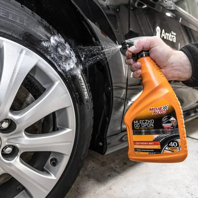 Aplicați laptele de îngrijire a anvelopelor Moje Auto pe o suprafață curată și uscată. Prin urmare, primul pas este să spălați bine anvelopele de orice murdărie și apoi să le uscați.