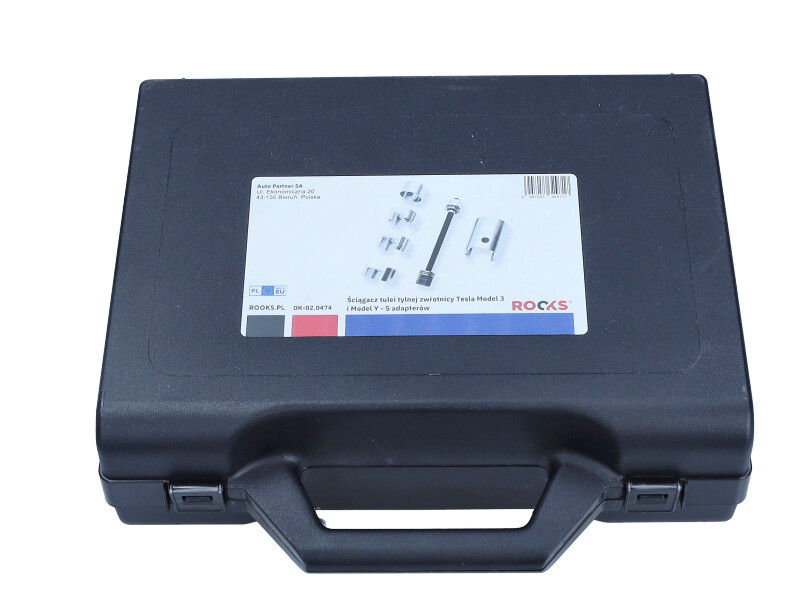Reprezintă un set de scule profesionale de la producătorul ROOKS, special conceput pentru demontarea și montarea (extragerea) bucșelor de la puntea spate (fuzetă) pentru modelele Tesla Model 3 și Model Y. Kitul include 5 adaptoare specifice și este utilizat pentru înlocuirea eficientă a brațelor de control, oferind o soluție precisă pentru reparațiile suspensiei.